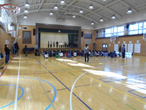 1月20日に、6年生から5年生にバトンを渡す引継ぎ式がありました。6年生の仕事である、「朝会での役割」「校旗掲揚」「クラブ・委員会の長」を5年生が引継ぎます。初めての掲揚に、子供たちは目を輝かせていました。