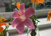 今朝、東側の桜の樹の下にピンクの大きな花をみつけました。この場所は、昨年までは工事区域だったので、もともとの様子は分かりません。もしかしたらどなたかが植えたのかもしれません。あるいは、球根や種がまぎれたのかもしれません。ピンクの大きな花がまるで造花のように咲いていました。見えにくいところに咲いているので、せっかくなので摘んできて来校者入口のところに見えるようにしておきました。調べて見ると「ゼフィランサス・ロゼア」という植物です。雨が降ると咲きやすい、ということが書いてあったので、昨日の夕立で咲いたのかもしれません。別名は「レインリリー」と呼ばれているそうです。