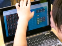 直接キャラクターを操作するのではなく、予め進む方向を順序だてて考え、意図したように進めるかどうかを試していきます。イメージの中ではうまく辿り着いたと思っていても、実際にプログラムしたものを動かしてみると思った動きと異なった動きをすることもあり、1年生はなかなか苦労しながら取り組んでいました。黒板には「あきらめない よく考える」と書かれていてこの課題の1年生にとっての難易度が伝わります。それでも、友達と協力したり何度も挑戦したりして、粘り強く取り組んでいる様子でした。タブレット端末はスマートフォンと同様に画面操作ができるので、その点は1年生はたいへん上手に操作していました。順次だてて考えていく力がつくといいなと感じました。
