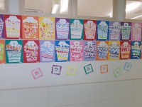 1年生のの教室前には、素敵なシャツが並んでいます。図工の時間に作品を作りました。絵具を使って色をつけました。クレヨンや色鉛筆と違って絵具を使うと色をたくさんつけることができます。筆のタッチで太さを変えることができます。絵具の色の濃さを調節てきます。これらの絵具ならではの特性を生かして、シャツの模様を描いていきました。カラフルなシャツが並び、見ていて楽しい気持ちになります。
