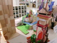 3年生の「積み木タワー」は木片を組み合わせて、自分がイメージするタワーの形を作っていきました。いろを付けたり形を工夫したりして仕上げていった様子が伝わります。4年生の「ミニマル君のお家」はミニマル君という人形に見立てた円柱形の木片が暮らすお家をそれぞれイメージして、ミニマル君の日常がよく分かる作品です。どちらも題名を見ると、作った子がもつイメージが何となく伝わってきて、題名と共に作品を楽しむことかできます。