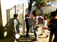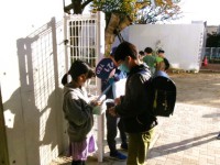 毎朝、校舎の東側と西側のところに立って、募金に協力してくれる子どもから、募金の入った封筒を受け取ります。また、協力の呼びかけをしていくことで、まだ募金をしていない子への働きかけを行いました。