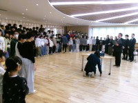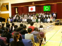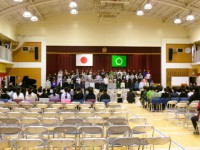 最後は、全校児童がスロープの周りの集合して、全校合唱の「カイト」を合唱しました。歌声が揃い、校舎全体に歌が響き渡りました。子どもも教職員もみんなでお祝いしていることが実感できる時間でした。締めくくりに、6年生が、スロープに集まった下級生全員の間を通って教室に戻っていきました。