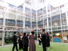 校歌を歌って式は終わりますが、その後去られる方に中庭に移動してもらい、全校児童の歌を聞いてもらいました。スロープに全員が集まり、中庭にいるみなさんにしっかりと届くように歌いました。さらに、3階からスロープを歩いて、全校の一人一人のお別れをしながらスロープを歩いてもらいました。