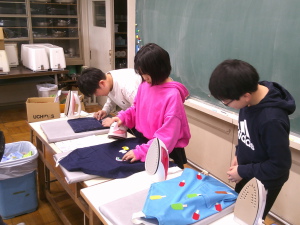 家庭科「ソーイングで生活を豊かに」の学習でミシンを使ったエプロンづくりをしています。この作品は展覧会に出展します。世界に一つだけのエプロンにするためにフェルトを使ってデザインをしていました。
