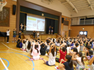 児童集会では、国立一小の先生に関するクイズをしました。「1度なってみたいキャラクター」や、「好きな給食」など先生のことを知って、盛り上がりました。