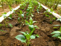 今日は2年生が、ひまわりプロジェクトの2回目の活動を行いました。夏草の道を通って郵政研修所の畑まで出かけました。6月17日にまいた種はどんどん成長しています。その苗を今日は間引きの作業を行いました。10本ほど固まって育ったひまわりの中で、一番大きく太い苗を選んで、それ以外を剪定します。2年生は、せっかく育った苗を切ってしまうことに戸惑いながらも、「固まって育つと全部が大きくならないけれど、1本だけ残すことで、その1本が栄養をぐんぐんと取って大きく成長します」という説明を聞き、作業を進めていきました。大切な苗なので、どれを残すか、慎重に慎重に苗の様子を観察して、1本を選びます。そして残りははさみで剪定していきました。この後、このひまわりが夏の太陽と雨でぐんぐんと育っていくことを期待しいてます。