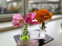 昨年までは、9月になると芙蓉の木が毎日たくさんの花を咲かせて楽しませてくれました。その花と同じ色の花が咲いたので、おそらくこぼれ種が根付いたと思います。芙蓉の花はとても立派な花ですが、朝顔と同じで1日で萎んでしまいます。せっかくなので摘んだ花は玄関に飾っておきました。写真のピンクの花が芙蓉です。まだ蕾があるので、少しの間は楽しめそうです。今は50センチほどの高さですが、以前のように3mほどに成長してたくさんの花を咲かせるようになるといいなと思います。
