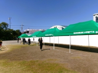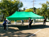 教職員も1時間目から準備を始めました。本部席・敬老席・児童席にはテントを張ります。昨年二小PTAからテントを寄贈していただき、それに加えて五小と二中からテントをお借りして、テントの下で参観することができます。たくさんのテントを準備しますが、最近のテントは設置方法がかなり工夫されていて、設置の手間が改善されています。よくできているなぁと感心します。全てのテントには杭を打って風に飛ばされないようにしました。