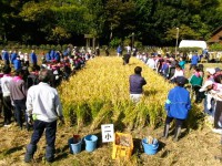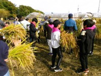 私は、5年生の稲刈りについていきましたが、今日は絶好の稲刈り日和でした。昨日の雨でぬかるんでいるかと思いましたが足元は乾いていて靴もさほど汚れずに稲刈りができていました。市内の農家さんや農業委員会の方、ボランティアの方が6月に植えた苗を丁寧に育てていただいたお陰で、稲穂が輝いていました。鎌を使って手刈りで作業をすすめました。まとめて干すところまでの作業を行いました。乾燥させて精米したものは学校に届くそうです。5年生は楽しみに待っている様子でした。