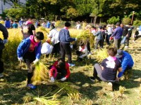 今日は昨日の雨があがり、爽やかな秋晴れの天候になりました。今日は1年生は、「秋をさがす」生活科の学習で北公園に出かけ、4年生は桐朋学園にプラネタリウムでの学習に出かけ、5年生は稲刈りに行きました。