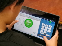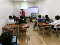 直接キャラクターを操作するのではなく、予め進む方向を順序だてて考え、意図したように進めるかどうかを試していきます。イメージの中ではうまく辿り着いたと思っていても、実際にプログラムしたものを動かしてみると思った動きと異なった動きをすることもあり、1年生はなかなか苦労しながら取り組んでいました。黒板には「あきらめない よく考える」と書かれていてこの課題の1年生にとっての難易度が伝わります。それでも、友達と協力したり何度も挑戦したりして、粘り強く取り組んでいる様子でした。タブレット端末はスマートフォンと同様に画面操作ができるので、その点は1年生はたいへん上手に操作していました。順次だてて考えていく力がつくといいなと感じました。