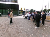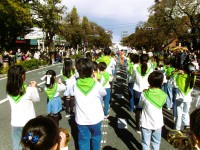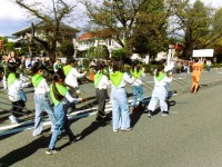 二小金管バンドの出番は、第2グループの先頭です。10時少し前にスタートして、大学通りを駅舎に向かって行進ほ始めました。今回は、吹奏楽フェスティバルと同様に3年生から6年生が参加しています。パレードは座っての演奏と違い、歩きながら楽器を奏でます。いつもとは勝手が違うので、パレードに向けて何回も練習してきました。