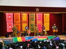 来ていただいたグループはアフリカ出身のアーティストと日本人メンバーによる融合バンド「アフリジャ」です。歌やパーカッション、ギター、サックスなどを使った楽しいアフリカンポップスを披露します。また、アーティストと一緒にリズムに乗ってダンスをしたりしました。異文化交流として 外国の楽器や音楽を通して、海外の文化を体験し、異文化への理解を深める機会になったと思います。今年は、1年生から6年生まで全員が参加しましたが、まさに笑顔と学びに満ちた体験活動になりました。