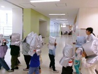 放送が入ると、廊下にいる子はしゃがんで「だんごむしのポーズ」でゆれに備えます。近くに入れる教室がある場合は教室に入って机の下に隠れます。校庭にいる子は、校舎から離れた位置いき、「だんごむしのポーズ」でゆれに備えます。ゆれが収まったあと、校舎内にいることが危険という判断になれば、校庭に集まります。そのときは「お か し も」の約束で集まります。