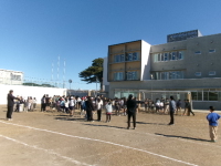 今日の4時間目の終わりごろ、6年生が校庭に集合していました。暑い最中に何かな、と思って様子を聞くと、卒業アルバムの集合写真を撮るとのことでした。校舎の方を見ると3階の教室にカメラマンさんがスタンバイしています。高いところから、全員が映るように並び方を上手に調整して集合写真を撮っていました。