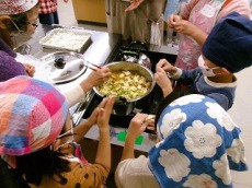 大勢の子どもたち保護者の方、そして育成会の方、保護者ボランティアの方が参加しました。始まりの会の後、4年生以上は野菜を切って汁を作る作業をします。3年生以下は、昔遊びを楽しみます。福笑い、お手玉、コマまわし、けん玉、皿回し、羽根つき、竹とんぼ、フラフープなどの遊びを担当してくれる大人の人と一緒に楽しみます。汁のベースができると、作業を交代して、3年生以下は団子を作って完成させます。団子といってもすいとんのように、小麦粉で作った生地を小さくちぎってのばして作るお団子です。