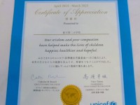 昨日の朝会のときに、代表委員会から先月行われたユニセフ募金の結果が発表されました。募金の合計額は、25219円です。みんなの大切な気持ちと大切なお金をユニセフに送ることができました。すでに、送金は済んでいて、ユニセフから感謝状が送られました。ユニセブ募金によって、世界の子どもたちの健康を向上させ、希望をつなぐことかできました、という日本語と英語で書かれたメッセージが書いてありました。きっと役に立っていると思います。