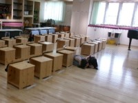 2学期になって、音楽室が少しリニューアルしました。1学期までは、新校舎と一緒に設置されていた机と椅子を使っていました。とても素敵な机と椅子なのですが、小学生には少々高さがありました。高学年の子には適していますが、3年生の子には少々高かった様子でした。座っていると足が浮いている子もいました。そこで、多目的室にある多摩産材で作られた椅子を使って見ることにしました。今までの椅子よりは若干低く、図工室でも使っているもと同じです。椅子にはものを入れられる工夫もあり、「音楽袋」を入れることができます。そして、器楽演奏のときは譜面台を使うことにしました。教科書や楽譜は譜面台にのせて演奏します。その譜面台は背面部分に下げることができ、すぐに使うことができます。今のところ具合が良さそうなので、この形で音楽室を使っていこうと考えています。