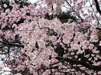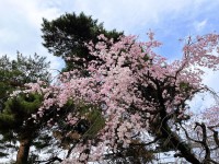 二松の横に植えられている枝垂れ桜は今が見頃の満開です。2種類のピンクの花が満開に咲いていて、二松の緑とのコントラストがとてもきれいだと思います。