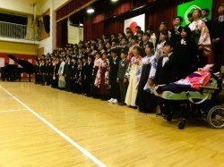 最後は、全校児童がスロープの周りの集合して、全校合唱の「カイト」を合唱しました。歌声が揃い、校舎全体に歌が響き渡りました。子どもも教職員もみんなでお祝いしていることが実感できる時間でした。締めくくりに、6年生が、スロープに集まった下級生全員の間を通って教室に戻っていきました。